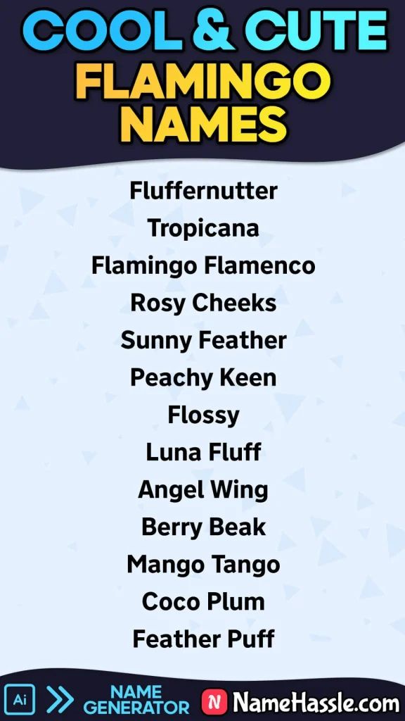 Flamingos are among the most elegant and eye-catching birds in the world. Known for their vibrant pink feathers, long legs, and quirky personalities, they deserve names that are just as unique and fun. Whether you have a pet flamingo (or a flamingo plush, character, or mascot), this guide will help you find the perfect flamingo In this ultimate list, you’ll discover 360 unique flamingo names, categorized for easy browsing β€” plus a fun flamingo name generator to create your own!